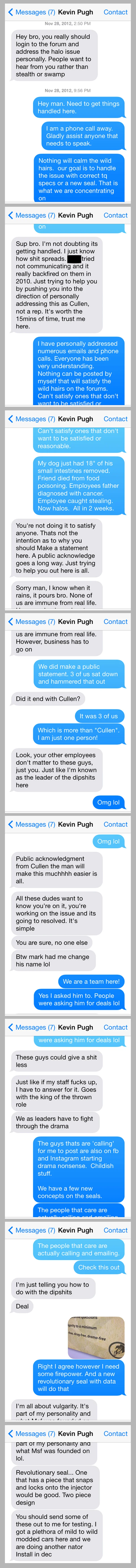 For a full history of text message correspondence between between mazdaspeedforums.org owner Kevin Pugh & SURE Motorsports CEO Cullen Mariacher, refer to the Text Message Correspondence page.